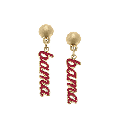 | Bama Script Earrings NEW! Price: $24.00BAMA SCRIPT EARRINGS Make a statement the Crimson Tide way with these Bama Script Earrings. Featuring a brushed gold stud top and a dangling crimson “Bama” script outlined in gold, these earrings bring bold spirit and polished style together in one eye-catching accessory. Perfect for game days, tailgates, or adding a pop of pride to your everyday look, they’re a must-have for fans across the country. Pair them with your favorite Alabama apparel and let everyone know where your loyalty stands. These standout earrings are available now at the University of Alabama Supply Store—your trusted Alabama Official Store for all the latest Bama merchandise and fan favorites. Roll Tide! Product Description: Pair of gold-tone stud earrings with dangling crimson “Bama” script charms outlined in gold for pierced ears. Item number 14054747Jane Envy, LLCMetal Made in ChinaNew Items: See more » | |