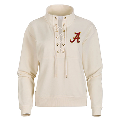 | Alabama Lace Up Pullover NEW! Price: $90.00ALABAMA LACE UP PULLOVER Add a touch of style to your Crimson Tide game day look with the Alabama Lace Up Pullover! This cream-colored top features a lace-up neckline with gold grommets for a chic, athletic finish, complemented by the embroidered crimson Script A logo on the chest. Perfect for layering or wearing on its own, this pullover blends feminine detail with timeless Alabama pride. Comfortable, stylish, and spirited—it’s a wardrobe must-have for any Bama fan. Available now at the University of Alabama Supply Store. Roll Tide! Product Description: A cream pullover featuring a lace-up neckline with gold grommets and an embroidered crimson Script A logo on the upper left chest. Made from soft fabric for a comfortable fit and classic style. Item number 14065927Boxercraft70% Cotton, 30% PolyesterMade in ChinaNew Items: See more » | |