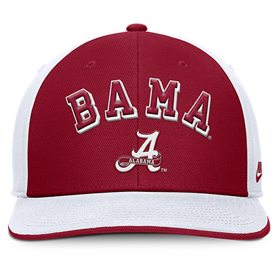 | Bama Nike Dri Fit Pro Legacy Snapback Cap NEW! Price: $32.00BAMA NIKE DRI FIT PRO LEGACY SNAPBACK CAP Take your Alabama pride to the next level with the Bama Nike Dri-FIT Pro Legacy Snapback Cap. Featuring bold “BAMA” lettering arched across the front with the Script A logo underneath, this crimson and white cap makes a statement wherever you go. The embroidered Nike Swoosh on the side completes the look. Available now at the University of Alabama Supply Store. Made with Nike’s Dri-FIT technology, this snapback keeps you cool and comfortable through gameday intensity or everyday wear. The adjustable closure ensures a perfect fit for every Crimson Tide fan. Roll Tide! Product Description: A crimson and white Nike snapback cap with “BAMA” lettering, Script A logo, embroidered Nike Swoosh, and Dri-FIT fabric. Features an adjustable snapback closure for comfort. Item number 14136351Fanatics, Inc100% CottonMade in VietnamNew Items: See more » | |
