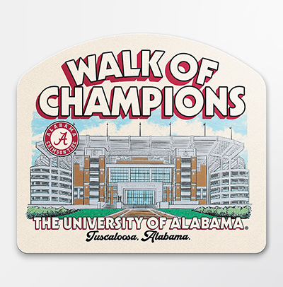 | Walk Of Champions Sticker NEW! Price: $5.00 - $6.00WALK OF CHAMPIONS STICKER Celebrate the legacy of Alabama football greatness with the Walk of Champions Sticker available in 2 sizes! Featuring a detailed illustration of Bryant-Denny Stadium and bold “Walk of Champions” lettering, this design captures the pride and tradition that define the Crimson Tide. It’s a perfect keepsake for alumni, students, and fans who know Tuscaloosa is where champions are made. Available now at the University of Alabama Supply Store! Roll Tide! Product Description: A rectangular sticker available in 2 sizes featuring an illustration of Bryant-Denny Stadium with the words “Walk of Champions” and “The University of Alabama, Tuscaloosa, Alabama.” Item number 14136658 2.5”, 14136412 3.5”Image One by Luttrell InvestmentsMade in USANew Items: See more » | |