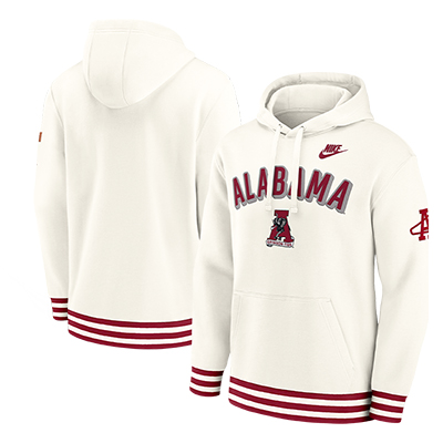 | Alabama Nike Legacy Retro Vault A Hoodie NEW! Price: $110.00ALABAMA NIKE LEGACY RETRO VAULT A HOODIE Celebrate Alabama tradition with a vintage twist in the Alabama Nike Legacy Retro Vault A Hoodie! This cream-colored hoodie features bold “ALABAMA” lettering across the chest, the retro Vault A logo with Big Al underneath, and crimson-striped cuffs and hem for a timeless, throwback look. Crafted with soft fleece for all-day comfort, this hoodie blends classic Crimson Tide heritage with Nike’s premium design. Perfect for chilly game days or everyday wear, it’s a must-have for any true Alabama fan. Available now at the University of Alabama Supply Store. Roll Tide! Product Description: A cream-colored Nike hoodie featuring “Alabama” text, the retro Vault A logo, and crimson-striped cuffs and waistband. Made from soft fleece with a front pocket and adjustable hood for comfort and warmth. Item number 13862473Fanatics, Inc99% Polyester, 1% ElastaneMade in ThailandNew Items: See more » | |