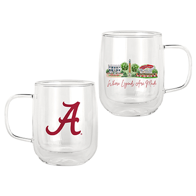 | Alabama Landmark Glass Mug NEW! Price: $29.00ALABAMA LANDMARK GLASS MUG Sip your favorite beverage with Crimson Tide pride using the Alabama Landmark Glass Mug with this nested layer! This beautifully designed mug features iconic campus landmarks like Denny Chimes, Bryant-Denny Stadium, and the President’s Mansion, along with the phrase “Where Legends Are Made.” The reverse side proudly displays the Script A logo, making it a perfect blend of elegance and school spirit. Available now at the University of Alabama Supply Store! Roll Tide! Product Description: A clear glass mug featuring illustrations of Alabama campus landmarks with the phrase “Where Legends Are Made” on one side and the crimson Script A logo on the other. Item number 14143540Valliant Gifts, IncAmanda Owens ArtNew Items: See more » | |
