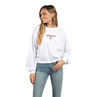 | Alabama Campus Crop Crew With Wrapped Up Bow NEW! Price: $85.00ALABAMA CAMPUS CROP CREW WITH WRAPPED UP BOW Stay cozy while keeping your Crimson Tide style effortlessly cool in the Alabama Campus Crop Crew. This soft, relaxed-fit sweatshirt features a minimalist “alabama” graphic with a small bow detail for a clean, modern look. The silhouette and classic crew neckline make it perfect for layering on crisp game days or pairing with your favorite denim for everyday wear. Grab yours now at the University of Alabama Supply Store—your go-to Alabama Store for elevated Alabama apparel and must-have Bama merchandise. Comfort meets classic Tide pride in a sweatshirt you’ll want to live in all season long. Roll Tide! Product Description: White long-sleeve crewneck sweatshirt with small “alabama” text and a small bow printed on the front. Item number 14174506Chicka-d by Indonesha LLC/University Girls60% Cotton, 40% PolyesterMade in ChinaNew Items: See more » | |
