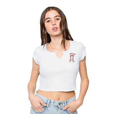 | Alabama Bow Cali T-Shirt NEW! Price: $48.00ALABAMA BOW CALI T-SHIRT Sweet meets spirited in the ALABAMA BOW CALI T-SHIRT. This fitted light gray crop tee features a subtle notch neckline and a delicate crimson “Alabama” script with a bow detail on the chest for a soft, feminine take on classic Crimson Tide style. Flattering and easy to pair with denim or game day skirts, it’s the perfect blend of trendy and timeless Alabama apparel for fans who love a little extra flair. Add this chic piece to your lineup—available now at the University of Alabama Supply Store, your trusted Alabama campus store for standout Bama merchandise and stylish fan gear. Roll Tide! Product Description: Light gray fitted cropped T-shirt with short sleeves, a small notch neckline, and crimson “Alabama” script with a bow graphic on the upper chest.Item number 14192630Hype and Vice95% Cotton, 5% SpandexMade in ChinaNew Items: See more » | |