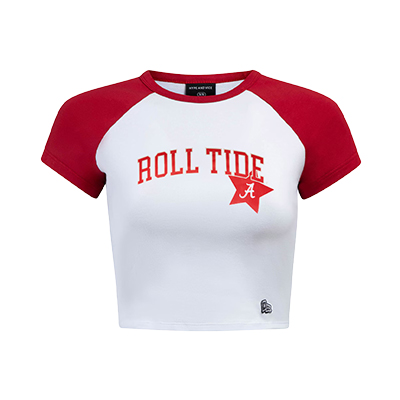 | Alabama Roll Tide Homerun T-Shirt NEW! Price: $45.00ALABAMA ROLL TIDE HOMERUN T-SHIRT Knock it out of the park with the ALABAMA ROLL TIDE HOMERUN T-SHIRT. This fitted white crop tee features bold crimson raglan sleeves and arched “Roll Tide” lettering across the front, finished with a star and Script A detail for extra spirit. Sporty, flattering, and full of attitude, it’s the perfect piece of Alabama apparel for game days in Tuscaloosa or cheering from anywhere across the country. Step up your Bama fan gear with this standout style, available now at the University of Alabama Supply Store, your go-to Alabama sports store for fresh Alabama merch and spirited looks. Roll Tide! Product Description: White cropped raglan T-shirt with crimson short sleeves, red “Roll Tide” text on the front, and a red star featuring a Script A logo. Item number 14192692Hype and Vice92.5% Cotton, 7.5% SpandexMade in ChinaNew Items: See more » | |