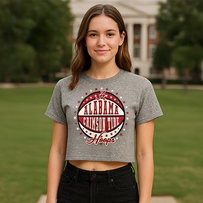 | Alabama Crimson Tide Hoops T-Shirt NEW! Price: $42.00ALABAMA CRIMSON TIDE HOOPS T-SHIRT Rep Bama basketball in bold style with the Alabama Crimson Tide Hoops T-Shirt. Featuring a circular “Alabama Crimson Tide Hoops” graphic with the Script A front and center, this cropped gray tee brings serious game day energy. The modern fit and standout design make it perfect for cheering on the Tide from the student section or showing your hoops pride anywhere across the country. Available now at the University of Alabama Supply Store—your favorite Alabama sports store for fresh Alabama gear and must-have Bama merchandise. From tip-off to the final buzzer, this top keeps your Crimson Tide spirit loud and clear. Roll Tide! Product Description: Gray cropped short-sleeve T-shirt with a circular “Alabama Crimson Tide Hoops” graphic and Script A logo printed on the front. Item number 14204036Pressbox by Royce Apparel65% Polyester, 20% Cotton, 12% Lyocell, 3% Other FiberMade in PakistanNew Items: See more » | |