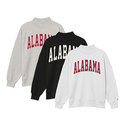 | Alabama Diana Mock Crewneck NEW! Price: $78.00ALABAMA DIANA MOCK CREWNECK Elevate your game day look with the Alabama Diana Mock Crewneck, a modern take on classic Crimson Tide style. Featuring bold arched “ALABAMA” lettering appliqued across the chest and a sleek mock neckline, this crew delivers a polished, on-trend silhouette that’s perfect for campus days, travel, or casual weekends. It’s an easy standout in any Alabama apparel rotation. Designed with a relaxed fit and soft fleece feel, this mock crewneck offers cozy comfort without sacrificing style. Available in versatile color options, it layers effortlessly with your favorite Alabama gear for a clean, put-together look. Find this must-have piece of Bama merchandise available now at the University of Alabama Supply Store, your go-to Alabama sports store for elevated Crimson Tide looks. Roll Tide! Product Description: A long-sleeve fleece mock-neck crewneck sweatshirt featuring arched “ALABAMA” lettering across the front, ribbed cuffs and hem, and a relaxed fit, available in multiple colors. Item number 14212505League by L2 Brands, LLC43% Polyester, 57% CottonMade in GuatamalaMore Colors Available New Items: See more » | |