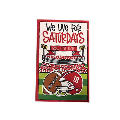 | We Live For Saturdays Garden Flag NEW! Price: $22.00WE LIVE FOR SATURDAYS GARDEN FLAG Show the neighborhood exactly where your loyalty stands with the We Live for Saturdays Garden Flag. Featuring a bold “We Live for Saturdays” message, a Roll Tide Roll banner, and a classic football and crimson helmet design, this flag brings unmistakable gameday energy to your yard or garden. Perfect for tailgate season or year-round display, it’s a spirited way to celebrate Alabama football right at home. Sleeve pocket ready for various display poles (not included). Available now at the University of Alabama Supply Store, this flag lets everyone know Saturdays in the South mean one thing—Roll Tide. Roll Tide! Product Description: Decorative garden flag with “We Live for Saturdays” text, a Roll Tide Roll banner, and football-themed graphics in Alabama crimson and white. Item number 14262678Magnolia LanePolyesterImportedNew Items: See more » | |