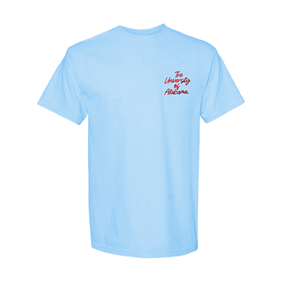 | Alabama Framed Stripes Comfort Color T-Shirt NEW! Price: $36.00 - $42.00ALABAMA FRAMED STRIPES COMFORT COLOR T-SHIRT Bring the spirit and sound off in the ALABAMA FRAMED STRIPES COMFORT COLOR T-SHIRT. Featuring a bold back graphic with “Rammer Jammer Yellow Hammer” framed in crimson script over striped detail, this tee is made for fans who know every word. The front keeps it classic with “The University of Alabama” in red script on the chest. Crafted in soft Comfort Colors fabric, it offers that relaxed, lived-in feel from the very first wear. Grab yours today at the University of Alabama Supply Store, your go-to Alabama merch destination for standout Bama merchandise. Roll Tide! Product Description: Light blue (hydrangea) Comfort Colors short-sleeve T-shirt with “The University of Alabama” in red script on the front chest and a large back graphic featuring “Rammer Jammer Yellow Hammer” in red script over vertical stripes inside a decorative frame. Item number 14274152Campus Collection100% CottonMade in HondurasNew Items: See more » | |