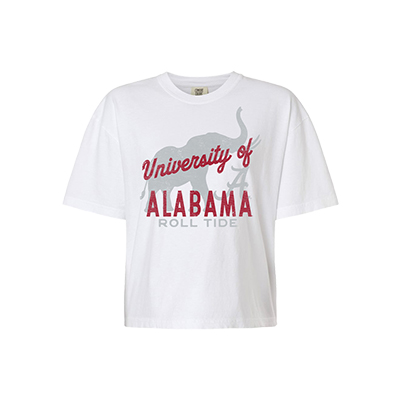 | Alabama Overlay Stamp Oversized Crop T-Shirt NEW! Price: $38.00ALABAMA OVERLAY STAMP OVERSIZED CROP T-SHIRT Effortlessly cool with classic Crimson Tide flair, the ALABAMA OVERLAY STAMP OVERSIZED CROP T-SHIRT is made for standout style. Featuring a bold “University of Alabama Roll Tide” graphic layered over a subtle elephant silhouette, this tee delivers vintage-inspired vibes with a modern oversized, cropped fit. The relaxed shape makes it perfect for pairing with high-waisted shorts or leggings on game day or around campus. It’s a fresh take on Alabama apparel that keeps your Bama pride front and center. Available now at the University of Alabama Supply Store, your trusted Crimson Tide store for must-have Alabama merch all year long. Roll Tide! Product Description: White oversized cropped T-shirt with a front graphic that reads “University of Alabama Roll Tide” layered over a gray elephant silhouette. Item number 14274442Campus Collection100% CottonMade in HondurasNew Items: See more » | |