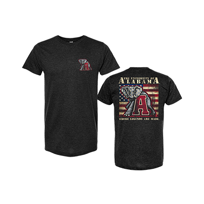 | Alabama Logo Flag T-Shirt NEW! Price: $22.00 - $30.00ALABAMA LOGO FLAG T-SHIRT Show your pride in crimson, white, plus red, white, and blue with the ALABAMA LOGO FLAG T-SHIRT. This dark heather tee features a front chest Vault A with Big Al, while the back makes a bold statement with a large Vault A and Big Al set against an American flag backdrop and “The University of Alabama – Where Legends Are Made.” It’s a powerful look that honors tradition, team spirit, and country all at once—perfect for game day and beyond. Stand tall in classic Bama style—available now at the University of Alabama Supply Store, your go-to Alabama sports store for standout Alabama merch and Bama fan gear. Roll Tide! Product Description: Dark heather short-sleeve T-shirt with a small Vault A and Big Al logo on the front chest and a large back graphic featuring a Vault A, Big Al, and an American flag design with University of Alabama text.Item number 14274992Campus Collection100% CottonMade in MexicoNew Items: See more » | |