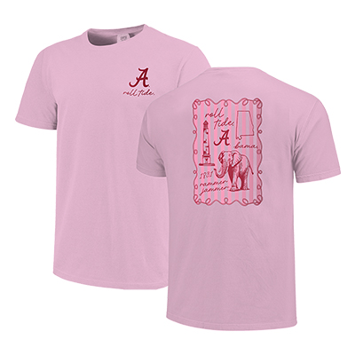 | Alabama Campus Sketch Frame Comfort Color T-Shirt NEW! Price: $34.00 - $38.00ALABAMA CAMPUS SKETCH FRAME COMFORT COLOR T-SHIRT Sweet Southern style meets Crimson Tide tradition in the ALABAMA CAMPUS SKETCH FRAME COMFORT COLOR T-SHIRT. This soft pink tee features a classic Script A with “roll tide.” on the front, while the back showcases a detailed sketch design framed in delicate lines, highlighting iconic Alabama elements like Denny Chimes, Big Al, the state outline, and “1831 Rammer Jammer.” Crafted from ultra-comfortable Comfort Colors fabric, it offers that relaxed, lived-in feel fans love in their favorite Alabama apparel. It’s the perfect blend of charm and pride for game days, campus visits, or everyday Bama spirit. Available now at the University of Alabama Supply Store, your go-to Alabama Alumni store for standout Bama fan gear. Roll Tide! Product Description: Light pink short-sleeve Comfort Colors T-shirt with a crimson Script A and “roll tide.” on the front chest and a large framed sketch graphic on the back featuring Denny Chimes, an elephant, the state of Alabama outline, and “1831 Rammer Jammer” text.Item number 14277269Campus Collection100% CottonMade in HondurasNew Items: See more » | |