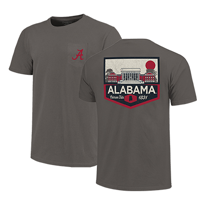 | Alabama Campus Two Tone Badge Comfort Color T-Shirt NEW! Price: $38.00 - $42.00ALABAMA CAMPUS TWO TONE BADGE COMFORT COLOR T-SHIRT Show off your Crimson Tide pride with a bold campus-inspired look in the ALABAMA CAMPUS TWO TONE BADGE COMFORT COLOR T-SHIRT. This rich neutral tee features a simple crimson Script A on the front pocket, while the back displays a striking two-tone badge design highlighting an iconic campus scene (Amelia Gayle Gorgas Library), “Alabama,” “Crimson Tide,” and 1831. The classic colors and vintage-style graphic give it a timeless feel that stands out in any collection of Alabama apparel. Made with soft Comfort Colors fabric, it offers that relaxed, broken-in comfort perfect for game days, tailgates, or everyday wear. Available now at the University of Alabama Supply Store, your trusted Alabama campus store for authentic Bama merchandise. Roll Tide! Product Description: Dark gray short-sleeve Comfort Colors pocket T-shirt with a crimson Script A on the front pocket and a large two-tone badge graphic (crimson and black on an aged beige) on the back featuring a quad-view of the Amelia Gayle Gorgas Library, “Alabama,” “Crimson Tide,” and “1831.”Item number 14277313Campus Collection100% CottonMade in HondurasNew Items: See more » | |