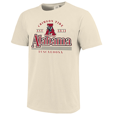 | Alabama Simple Vintage Comfort Color T-Shirt NEW! Price: $34.00 - $38.00ALABAMA SIMPLE VINTAGE COMFORT COLOR T-SHIRT Classic never goes out of style. The ALABAMA SIMPLE VINTAGE COMFORT COLOR T-SHIRT features a timeless design with “Crimson Tide,” Est. 1831, and Tuscaloosa details surrounding a bold Vault A and Big Al graphic. Set against a neutral backdrop, the crimson and black print delivers that old-school look every fan can appreciate. Made with ultra-soft Comfort Colors fabric, this tee has a relaxed fit and broken-in feel that makes it a go-to piece of Alabama apparel for game days, alumni weekends, or everyday wear. It’s effortless, traditional, and unmistakably Bama. Available now at the University of Alabama Supply Store, your trusted Crimson Tide store for premium Alabama merch. Roll Tide! Product Description: Ivory short-sleeve Comfort Colors T-shirt with crimson and black “Crimson Tide,” Est. 1831, Tuscaloosa text and a large Vault A with Big Al graphic printed on the front.Item number 14277368Campus Collection100% CottonMade in HondurasNew Items: See more » | |