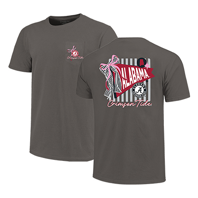 | Alabama Pennant Stripes Comfort Color Pocket T-Shirt NEW! Price: $38.00 - $42.00ALABAMA PENNANT STRIPES COMFORT COLOR POCKET T-SHIRT Classic spirit with a girly twist—the ALABAMA PENNANT STRIPES COMFORT COLOR POCKET T-SHIRT is ready for your next game day. This soft neutral tee features a front pocket graphic with a Script A and bow detail, while the back showcases a bold Alabama pennant layered over striped accents, complete with a pink bow, Script A seal, and “Crimson Tide” script. The mix of crimson, pink, and black gives it standout style while keeping that timeless Bama pride front and center. Made with ultra-comfy Comfort Colors fabric, it’s the perfect addition to your favorite Alabama apparel rotation. Available now at the University of Alabama Supply Store, your trusted Alabama campus store for the cutest Bama fan gear and Alabama merch. Roll Tide! Product Description: Dark gray short-sleeve Comfort Colors pocket T-shirt with a small Script A and bow graphic on the front pocket and a large striped pennant design on the back reading “Alabama” with a bow, Script A seal, and “Crimson Tide” text.Item number 14277412Campus Collection100% CottonMade in HondurasNew Items: See more » | |