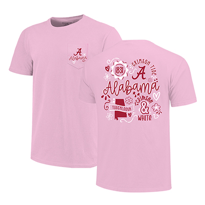 | Alabama Dots And Doodles Comfort Color Pocket T-Shirt NEW! Price: $38.00 - $42.00ALABAMA DOTS AND DOODLES COMFORT COLOR POCKET T-SHIRT Add a little extra fun to your game day look with the ALABAMA DOTS AND DOODLES COMFORT COLOR POCKET T-SHIRT. This soft pink Comfort Colors tee features a front pocket design with a Script A and “Alabama,” while the back bursts with playful doodles, hearts, florals, “1831,” “Tuscaloosa,” and “Crimson & White” surrounding bold Alabama lettering. It’s a cheerful, spirited take on classic Crimson Tide pride that stands out in any collection of Alabama apparel. With its relaxed fit and lived-in softness, it’s perfect for campus days, tailgates, or repping Bama wherever you go. Available now at the University of Alabama Supply Store, your favorite Crimson Tide store for standout Bama merchandise and Alabama merch. Roll Tide! Product Description: Light pink short-sleeve Comfort Colors pocket T-shirt with a small Script A and “Alabama” graphic on the front pocket and a large doodle-style design on the back featuring “Alabama,” “1831,” “Tuscaloosa,” “Crimson & White,” hearts, and floral accents.Item number 14277566Campus Collection100% CottonMade in HondurasNew Items: See more » | |