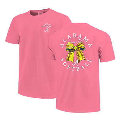 | Alabama Softball Bow Tshirt NEW! Price: $34.00ALABAMA SOFTBALL BOW TSHIRT - Youth Cheer on the Crimson Tide in sweet, sporty style with the ALABAMA SOFTBALL BOW TSHIRT. This vibrant pink youth tee features a subtle front chest design with “Alabama Softball” and the Script A, while the back makes a bold statement with a bright yellow softball-stitched bow, “Crimson Tide,” and a classic Script A at the center. Framed by “Alabama Softball,” the eye-catching graphic brings energy and charm to your young one’s game day look. It’s the perfect addition to their Alabama apparel lineup for the ballpark, campus, or anywhere they’re showing Bama pride. Available now at the University of Alabama Supply Store, your go-to Alabama sports store for spirited Bama youth and adult merchandise and fan favorites. Roll Tide! Product Description: Pink short-sleeve youth T-shirt with a small “Alabama Softball” and Script A graphic on the front chest and a large yellow softball bow design on the back with “Alabama Softball,” “Crimson Tide,” and a Script A logo.Item number 14279195Campus Collection100% CottonMade in HondurasNew Items: See more » | |