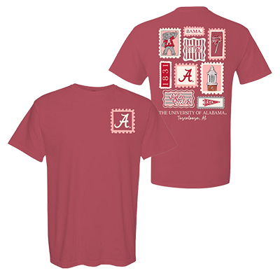 | Alabama Stamp Collage Comfort Color T-Shirt Price: $36.00 - $42.00ALABAMA STAMP COLLAGE COMFORT COLOR T-SHIRT Send your Bama spirit coast to coast in the ALABAMA STAMP COLLAGE COMFORT COLOR T-SHIRT. Featuring a bold back collage of vintage-inspired “stamp” graphics—Big Al, Script A, 1831, Denny Chimes, Roll Tide, and more—this tee captures the heart of Tuscaloosa in one standout design. The front chest stamp detail adds the perfect finishing touch. Made in classic Comfort Colors style, it’s soft, relaxed, and ready for game days or everyday wear. Grab yours now at the University of Alabama Supply Store, your trusted Alabama campus store for iconic Bama merchandise. Roll Tide! Product Description: Crimson short-sleeve Comfort Colors T-shirt with a small Script A stamp graphic on the front chest and a large Alabama-themed stamp collage on the back featuring Big Al, Script A logos, 1831, Denny Chimes, and Roll Tide text. Item number 14274107Campus Collection100% CottonMade in HondurasT-Shirts: See more » | |