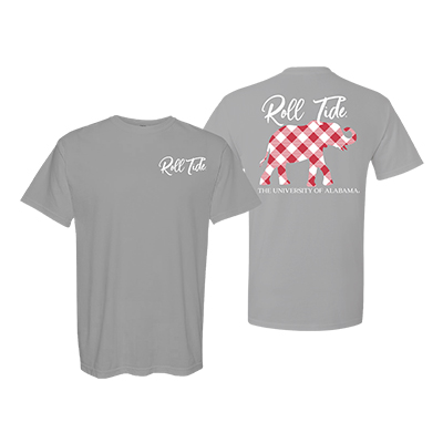 | Alabama Check Elephant Comfort Color T-Shirt NEW! Price: $36.00 - $42.00ALABAMA CHECK ELEPHANT COMFORT COLOR T-SHIRT Classic meets charming in the ALABAMA CHECK ELEPHANT COMFORT COLOR T-SHIRT. This soft gray tee features a simple “Roll Tide.” script on the front and a bold back graphic showcasing an elephant filled with a crimson and white check pattern above “The University of Alabama.” It’s a fresh yet timeless look that pairs perfectly with jeans, shorts, or your favorite game day layers. Crafted from Comfort Colors fabric, it delivers that relaxed, lived-in feel fans love in standout Alabama apparel. Available now at the University of Alabama Supply Store, your trusted Alabama merch destination for unique Bama fan gear across the country. Roll Tide! Product Description: Gray short-sleeve Comfort Colors T-shirt with “Roll Tide.” printed on the front chest and a large red and white checkered elephant graphic with “The University of Alabama” text on the back. Item number 14274343Campus Collection100% CottonMade in HondurasT-Shirts: See more » | |