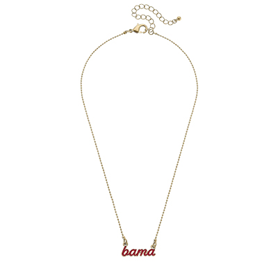 | Bama Script Necklace Price: $24.00BAMA SCRIPT NECKLACE Show your Crimson Tide spirit with timeless style when you wear the Bama Script Necklace! Featuring elegant gold-tone detailing and a sleek red script “bama” pendant, this necklace adds the perfect touch of team pride to any outfit — from game day looks to everyday wear. Its adjustable chain ensures a comfortable, customized fit you’ll love. Celebrate your Alabama pride with this chic accessory, available now at the University of Alabama Supply Store! Roll Tide! Product Description: A gold-tone necklace with an adjustable chain and a red “bama” script pendant, designed to show team spirit in a stylish, minimalist way. Item number: 14054730Canvas Style by JANE ENVY LLCMetalMade in ChinaJewelry: See more » | |