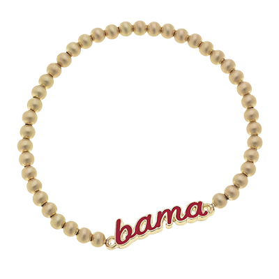 | Bama Script Beaded Bracelet Price: $24.00BAMA SCRIPT BEADED BRACELET Show off your Crimson Tide pride with effortless elegance in the Bama Script Beaded Bracelet! This gold-tone stretch bracelet features smooth round beads and a bold red “bama” script charm that captures your school spirit in chic style. Perfect for stacking with other bracelets or wearing solo for a subtle pop of team pride, it’s a versatile accessory for any Alabama fan. Add this charming piece to your game day or everyday look — available now at the University of Alabama Supply Store! Roll Tide! Product Description: A gold-tone stretch bracelet featuring round beads and a red “bama” script charm, designed for easy wear and stylish team spirit. Item number: 14054754Canvas Style by JANE ENVY LLCMetalMade in ChinaJewelry: See more » | |