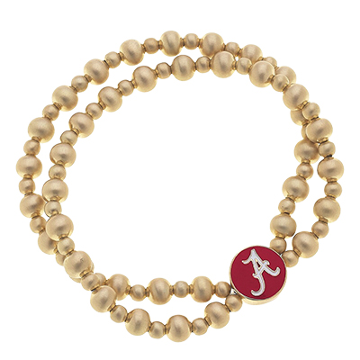 | Script A 2-Row Beaded Stretch Bracelet Price: $34.00SCRIPT A 2-ROW BEADED STRETCH BRACELET Add a touch of Crimson Tide elegance to your game day look with the Script A 2-Row Beaded Stretch Bracelet! Featuring two rows of gold-tone beads and a bold crimson charm with the iconic Script A logo, this bracelet effortlessly combines team pride with sophisticated style. The stretch design ensures a comfortable fit for all-day wear — perfect for cheering on Alabama or elevating your everyday outfit. Show your Bama spirit in style with this must-have accessory, available now at the University of Alabama Supe Store! Roll Tide! Product Description: A two-row gold beaded stretch bracelet featuring a crimson circular charm with the Alabama Script A logo. Item number: 14054839Canvas Style by JANE ENVY LLCMetalMade in ChinaJewelry: See more » | |