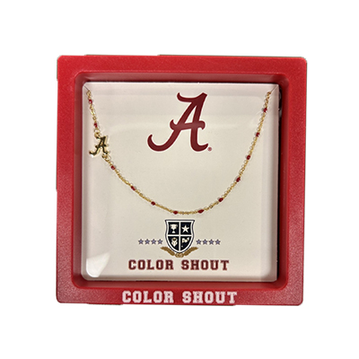 | Script A Side Set Necklace Price: $40.00SCRIPT A SIDE SET NECKLACE Add a touch of Crimson Tide elegance to your look with the Script A Side Set Necklace! Featuring a delicate gold chain accented with crimson accents, this necklace shines with Alabama pride. The signature Script A charm sits stylishly to the side, creating a unique and fashionable design perfect for any occasion—from gameday to everyday wear. Show your Bama spirit with subtle sophistication! This beautiful piece is available now at the University of Alabama Supply Store. Roll Tide! Product Description: A gold beaded necklace featuring red accents with a side-set Alabama Script A charm. Item number 14056642 Color Shout, LLCMetalImportedJewelry: See more » | |