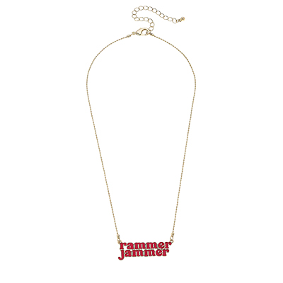 | Rammer Jammer Necklace Price: $25.00RAMMER JAMMER NECKLACE Celebrate every Crimson Tide victory in style with the Rammer Jammer Necklace! This chic gold chain features the bold crimson “rammer jammer” pendant—a nod to one of Alabama’s most beloved cheers. Perfect for pairing with Gameday outfits or layering with your favorite jewelry, this necklace adds just the right touch of Bama pride and flair. Show your winning spirit with this statement piece—available now at the University of Alabama Supply Store! Roll Tide! Product Description: A gold necklace with an adjustable chain and crimson “rammer jammer” pendant. Item number: 14180354Canvas Style by JANE ENVY LLCMetalMade in ChinaJewelry: See more » | |