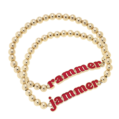 | Rammer Jammer Ball Bead Bracelets Set Of 2 Price: $38.00RAMMER JAMMER BALL BEAD BRACELETS SET OF 2 Cheer on the Crimson Tide in style with the Rammer Jammer Ball Bead Bracelets Set of 2! This gold beaded bracelet duo features bold red “rammer” and “jammer” charms, a nod to Alabama’s iconic post-game chant. Perfect for stacking, gifting, or adding a little Gameday sparkle, these bracelets bring the ultimate Bama spirit to any outfit. Celebrate every victory with Crimson Tide flair—available now at the University of Alabama Supply Store! Roll Tide! Product Description: A set of two gold ball-bead bracelets featuring red “rammer” and “jammer” charms inspired by Alabama’s famous cheer. Item number: 14180408Canvas Style by JANE ENVY LLCMetalMade in ChinaJewelry: See more » | |
