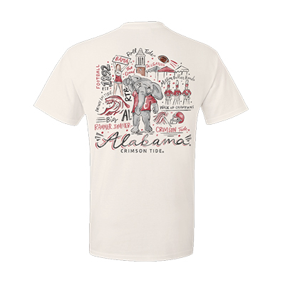 | Alabama Game Day Collage Comfort Color T-Shirt Price: $38.00 - $48.00ALABAMA GAME DAY COLLAGE COMFORT COLOR T-SHIRT Celebrate all the traditions that make Bama special with the Alabama Game Day Collage Comfort Color T-Shirt! Featuring Big Al at the center of a lively design filled with game day icons like Denny Chimes, the Million Dollar Band, the Walk of Champions, and more, this shirt captures the full Crimson Tide spirit. Made with soft Comfort Color fabric, this ivory tee is perfect for wearing to class, hanging out on the Quad, or tailgating before kickoff. It’s a wearable piece of Alabama pride that highlights everything fans love about game day. Available now at the University of Alabama Supply Store! Roll Tide! Item number 14185250Campus Collection100% CottonMade in HondurasT-Shirts: See more » | |