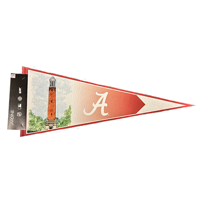 | Denny Chimes Penant Price: $15.00DENNY CHIMES PENNANT Celebrate one of The University of Alabama’s most iconic landmarks with this Denny Chimes Pennant. Featuring a beautiful artistic rendering of Denny Chimes alongside the classic Script A logo, this pennant is the perfect way to show your Crimson Tide pride. Its rich crimson gradient and timeless design make it ideal for decorating dorm rooms, offices, or any Alabama fan space. Whether displayed on your wall or taken to the big game, this pennant is a true tribute to the tradition and spirit of The Capstone. Available now at the University of Alabama Supply Store! Roll Tide! Product Description: Felt pennant featuring an illustrated Denny Chimes design and Alabama Script A logo on a crimson-to-cream gradient background with white tip. Item number: 14130090MARRINAN and ASSOCIATES dba JARDINE ASSOCIATESFeltMade in USABanners, Flags, Yard Signs: See more » | |