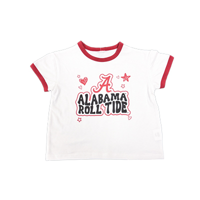| Alabama Roll Tide Camper Tshirt Price: $28.00ALABAMA ROLL TIDE CAMPER TSHIRT Start their Crimson Tide spirit early with the ALABAMA ROLL TIDE CAMPER TSHIRT. This adorable white tee features crimson trim and a playful front graphic with the Script A above “Alabama Roll Tide,” surrounded by fun hearts and stars. The bright, cheerful design makes it perfect for young fans showing their love for Bama on game day, at family gatherings, or during everyday adventures while representing their favorite team in classic Alabama apparel style. Available now at the University of Alabama Supply Store, your trusted Alabama campus store for standout Bama fan gear across the country. Roll Tide! Product Description: White short-sleeve youth T-shirt with crimson collar and sleeve trim featuring a Script A above “Alabama Roll Tide” text with small heart and star graphics on the front.Item number 14188404ZooZatz Kids by ROSS SPORTSWEAR INC55% Cotton, 40% Polyester, 5% SpandexMade in ChinaKids: See more » | |