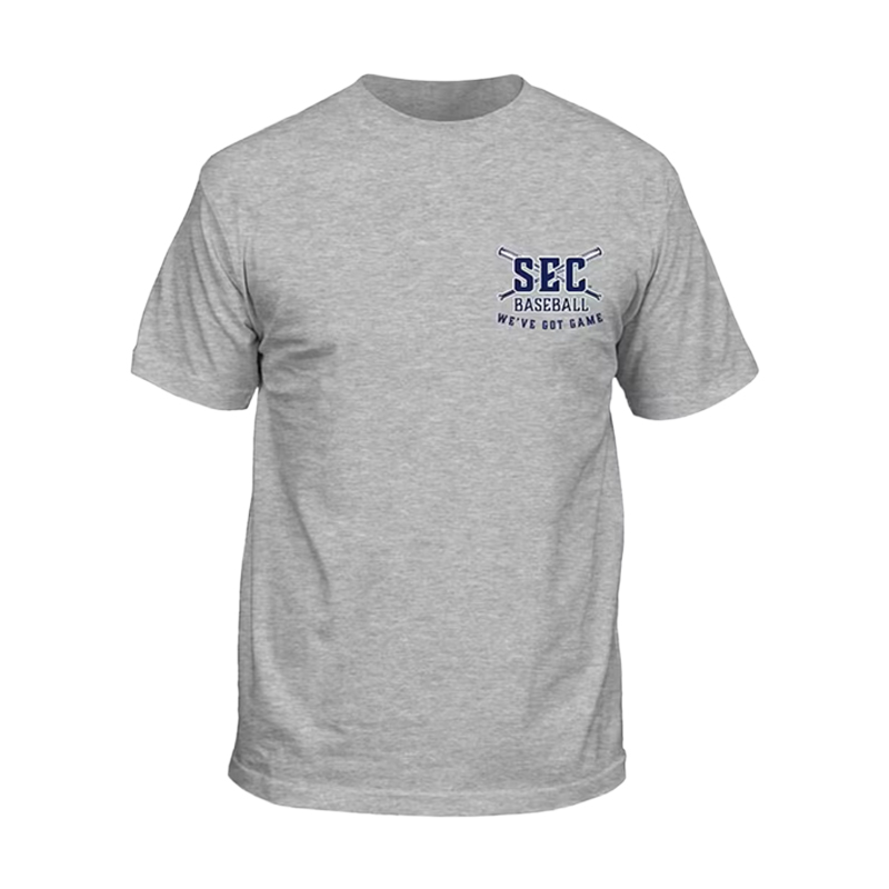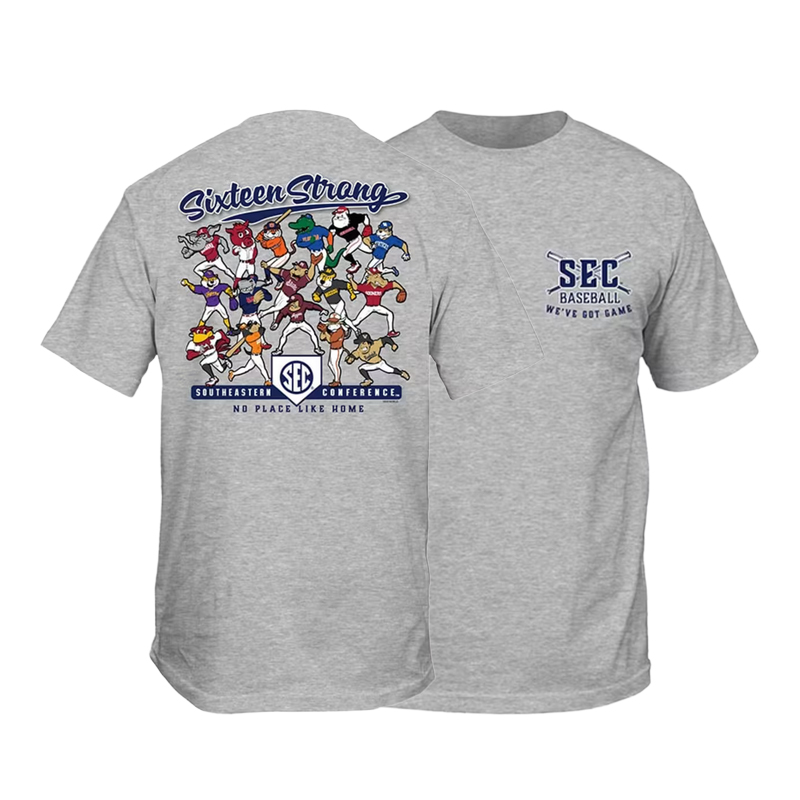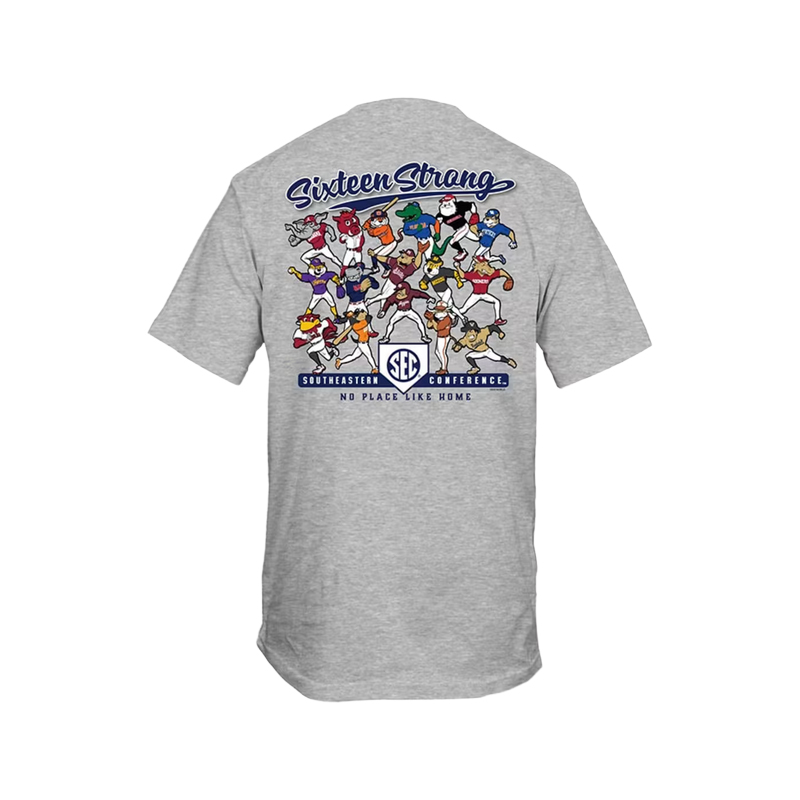 Product Description: A heather gray short sleeve T-shirt with a small SEC Baseball logo and crossed bats printed on the left chest and a large illustrated graphic of SEC baseball mascots with “Sixteen Strong Southeastern Conference” printed on the back.