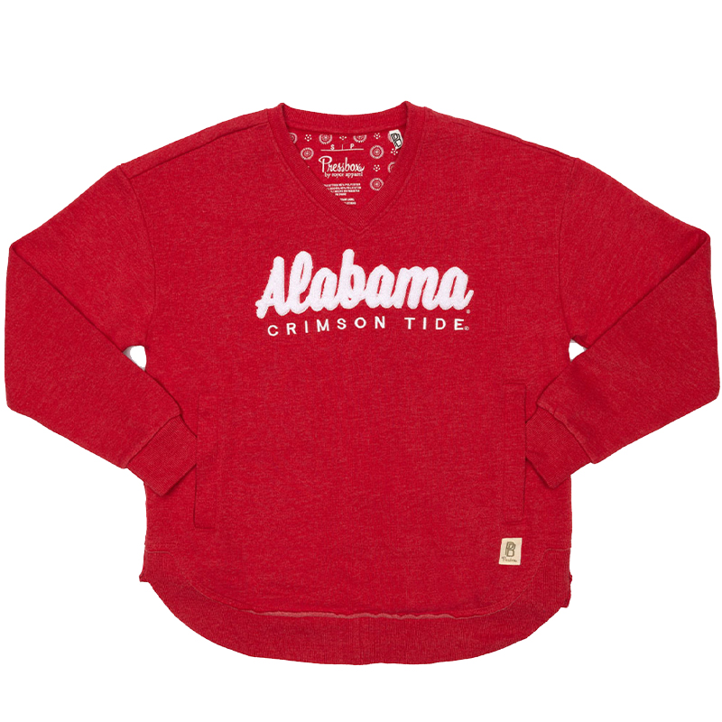 Stay cozy and spirited with the Alabama Alexandra East Hall V Neck Fleece! This soft crimson pullover features a relaxed fit, front pocket, and a flattering V-neckline for a touch of casual charm. The bold “Alabama Crimson Tide” chenille-style lettering adds texture and standout style, making it perfect for game days, study sessions, or lounging around Bryant-Denny tailgates.