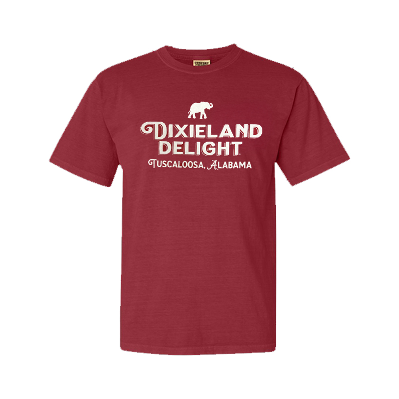 Product Description: 100% cotton short sleeve tee featuring a “Dixieland Delight Tuscaloosa, Alabama” design with an elephant graphic. Available in crimson and natural color options.