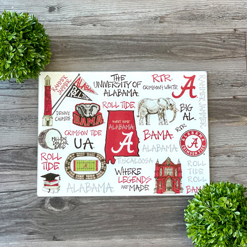 Show off your Crimson Tide pride right in your kitchen with the University of Alabama Tempered Glass Cutting Board! Featuring vibrant artwork of iconic Bama symbols like Denny Chimes, Big Al, Bryant-Denny Stadium, and the Script A, this board is as stylish as it is functional.
