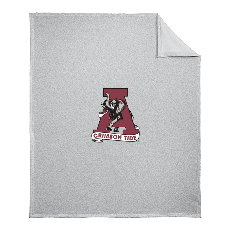 Product Description: A heather gray sweatshirt-style blanket featuring the vintage Vault A elephant logo and “Crimson Tide” text printed in the center.