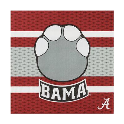 Add a touch of Crimson Tide pride to your tailgate or party with these Big Al Luncheon Napkins! Featuring a bold elephant paw print, classic crimson and gray stripes, and the iconic Script A and BAMA logo, these napkins are perfect for keeping things clean while showing off your Alabama spirit. Whether you're serving game day snacks or hosting a birthday bash, these napkins are a winning addition to your celebration lineup. 6.5” inch square.