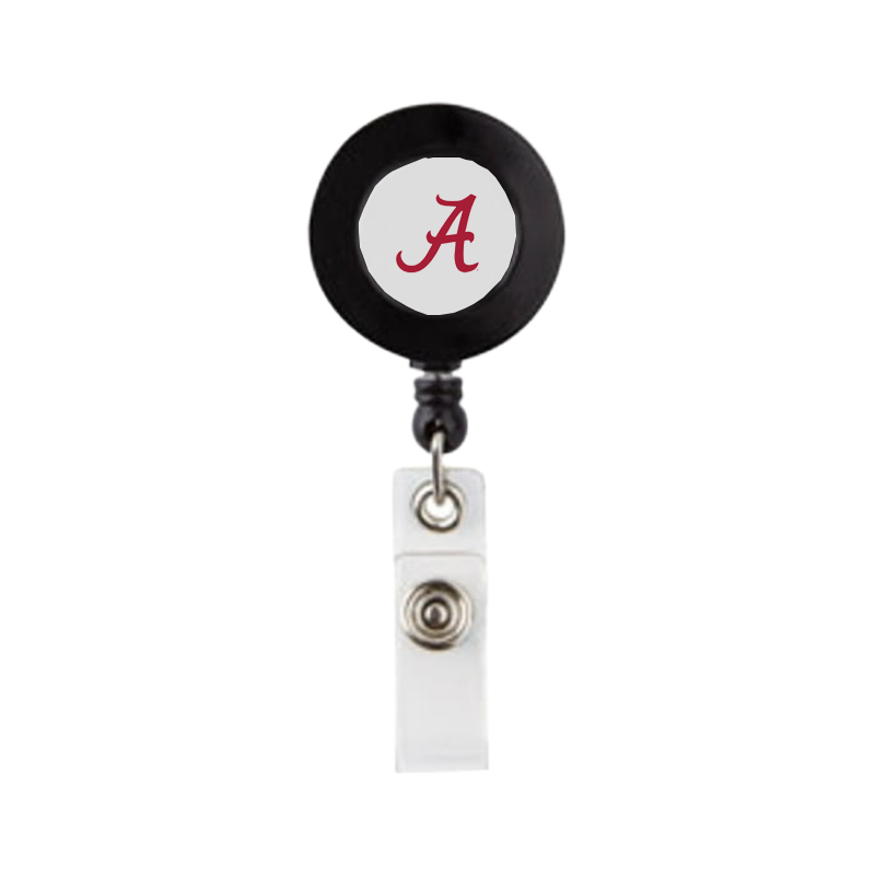 Product Description: A retractable badge reel with a black casing and an Alabama Script A logo, designed for holding and extending an ID card.