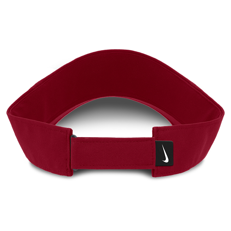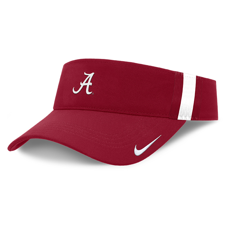 Product Description: A crimson Nike visor with the Alabama Script A logo, white side stripes, Nike Swoosh, and adjustable strap.