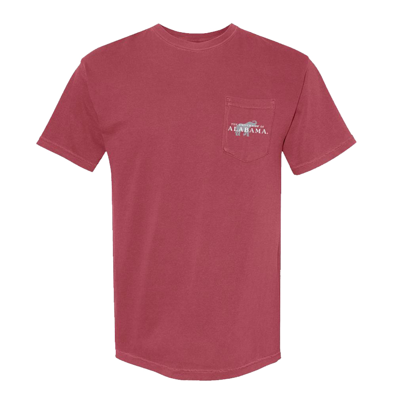Classic comfort meets Crimson Tide pride with the Alabama Subtle Elephant Comfort Color Pocket T-Shirt. Featuring a timeless pocket design on the front with “The University of Alabama” details, this tee showcases a bold elephant graphic across the back for a look that’s both understated and powerful. Made with soft, garment-dyed fabric, it’s built for all-day comfort whether you’re on campus, at the game, or just relaxing.