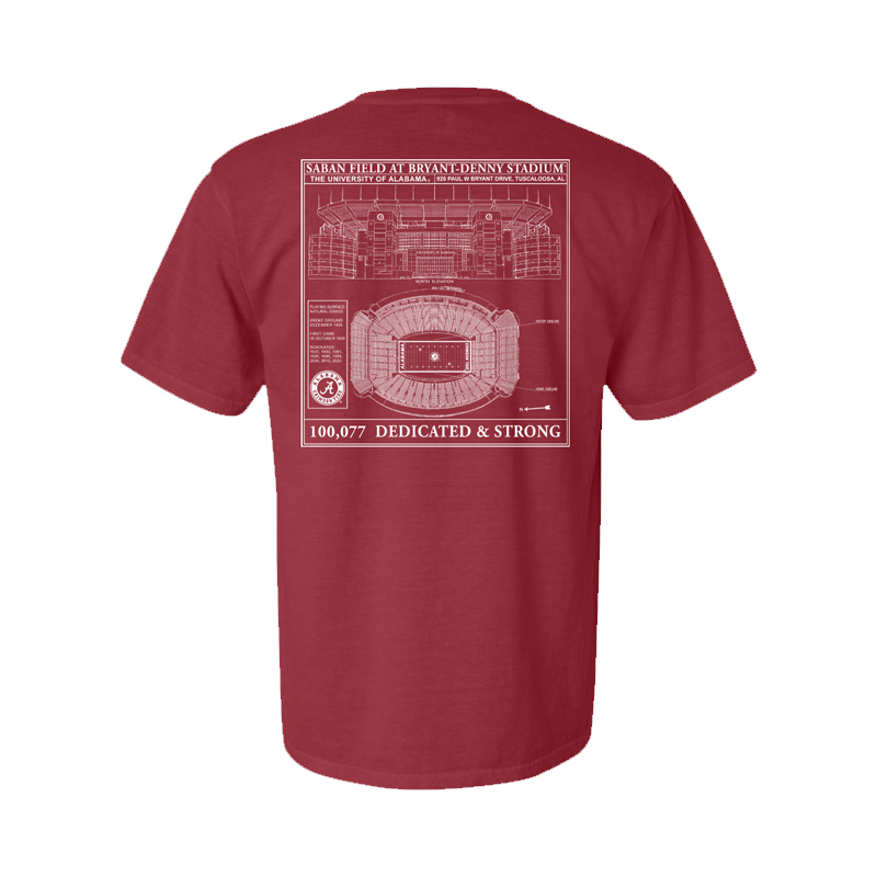 ALABAMA STADIUM BLUEPRINT COMFORT COLOR T-SHIRT Celebrate the heart of Crimson Tide tradition with the Alabama Stadium Blueprint Comfort Color T-Shirt! Featuring a front pocket design with the Script A and a detailed blueprint of Bryant-Denny Stadium on the back, this tee is perfect for fans who love Alabama football history and pride.