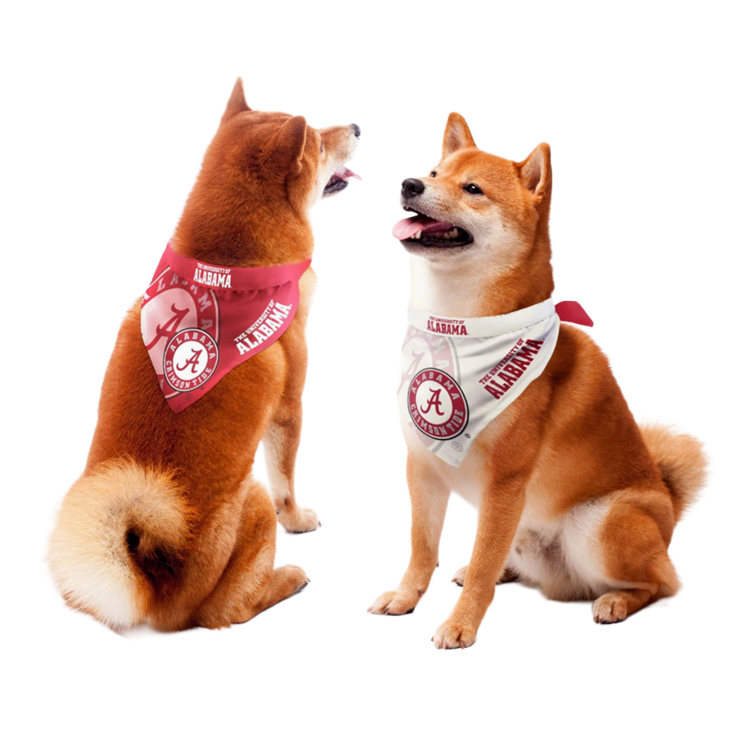 Product Description: A reversible pet bandana in crimson and white featuring the Alabama Script A logo and team name, designed for dogs to wear comfortably at home or away games.