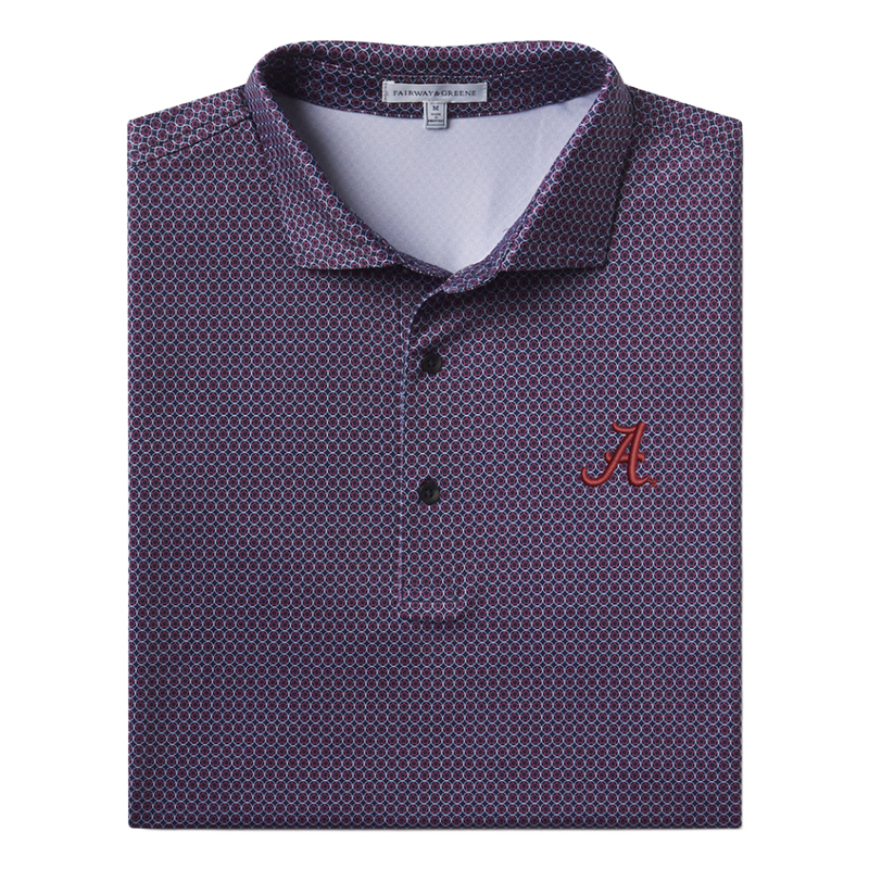 Product Description: A patterned Fairway & Greene performance polo featuring a subtle geometric design of a white circle, a red star on a navy background, and embroidered Alabama Script A logo on the chest.