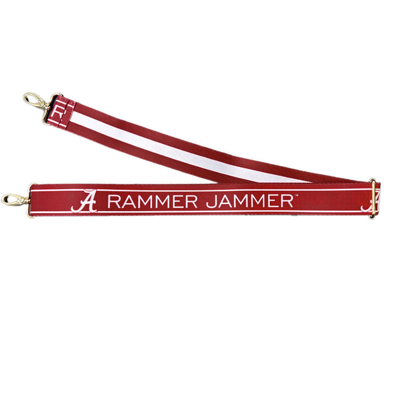 Make every bag a statement piece with the Alabama Rammer Jammer Purse Strap! This bold crimson strap features a white stripe accent and “RAMMER JAMMER” lettering alongside the Script A logo, showing off your Tide pride in style. With gold-tone hardware and adjustable length, it easily clips onto your favorite handbag or clear game day tote.