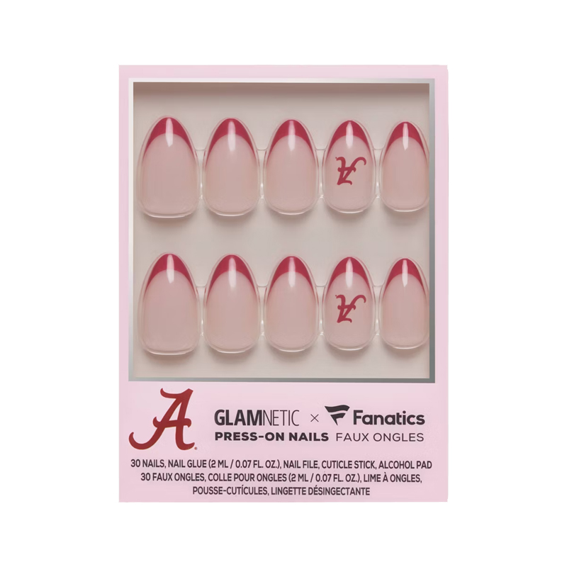 Bring your game day glam to a whole new level with these Script A Glamnetic Press-On Nails! Featuring a pink-toned base with a bold crimson French tip and the iconic Script A accent nail, this set lets you show off your Alabama pride with every wave, cheer, and high-five. Easy to apply and long-lasting, these press-ons are perfect for tailgates, watch parties, or adding a subtle touch of Crimson Tide spirit to your everyday style. Grab yours now at the University of Alabama Supply Store and get ready to cheer in style!