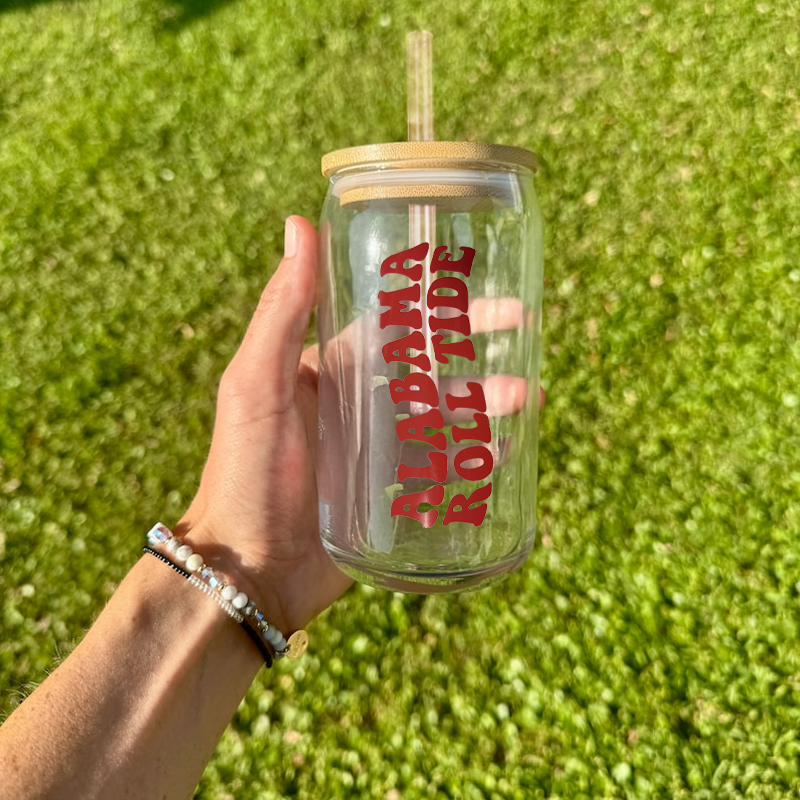 Sip in style with the Alabama Roll Tide Glass, perfect for showing off your Crimson Tide pride with every drink. Featuring bold crimson “Alabama Roll Tide” lettering and a bamboo lid with a reusable straw, this eco-friendly tumbler is great for iced coffee, smoothies, or your favorite game day beverages. Whether you’re tailgating, lounging at home, or strolling across campus, this glass keeps your Bama spirit front and center. Available now at the University of Alabama Supply Store.