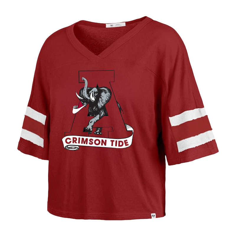 Channel vintage varsity vibes with the Alabama Crimson Tide Premier Scout Crop Tee by ’47 Brand! This bold, boxy crop features a retro Crimson Tide elephant graphic front and center, set against a classic oversized “A.” With sporty double stripes on the sleeves and a relaxed V-neck fit, it’s made for game day greatness and everyday spirit. Pair it with high-waisted denim or leggings for a look that screams Bama pride.