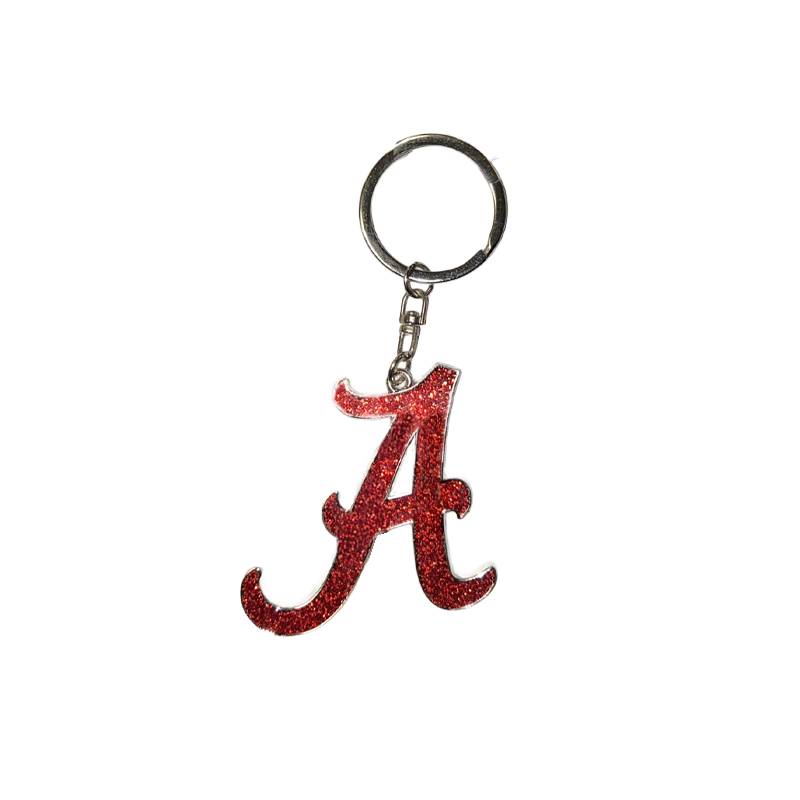 Product Description: A metal keychain featuring the University of Alabama Script A logo in sparkling red glitter with a silver key ring attachment.