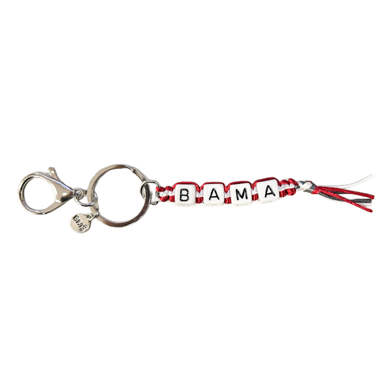 Product Description: A braided crimson, white, and gray keychain featuring letter beads that spell “BAMA” with a metal clasp and keyring attachment.